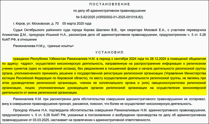 И такое решение судебных органов отнюдь не единичное. В марте 2025-го суд Кирова выписал штраф в размере 30 тысяч рублей узбекскому гастарбайтеру Нурилло Мухторжону угли Рахмоналиеву за совершение намаза в общежитии университета. И вновь в обосновании сказано: