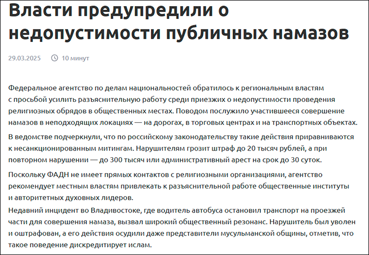 ФАДН призывает мигрантов не нарушать законодательство нашей страны и отказаться от практики совершения намазов в общественных местах. Скриншот страницы сайта rahmat.ru