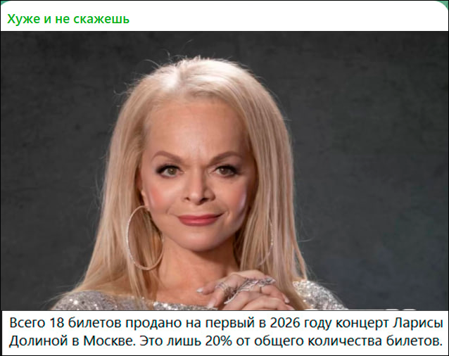 Ну, и неудивительно, что на этом фоне билеты на концерты певицы снова перестали продаваться. Так, на первый концерт Ларисы Долиной в 2026 году, который должен пройти 27 января в московском баре Petter, к данному моменту продано всего 18 билетов. Это составляет лишь 20% от общей вместимости зала.