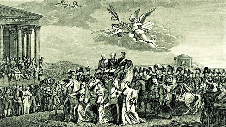 Священный союз олицетворял план европейского будущего, где правили бы традиция, мир и сотрудничество между христианскими монархиями. Гравюра "Освободители Европы" Карделли Сальваторе, 1815 год. Скриншот: en.ppt-jnline.org
