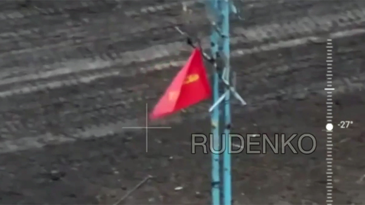 Бойцы 114-й отдельной гвардейской мотострелковой бригады водрузили знамя Победы на стеле с надписью Авдеевка, где в свое время делал селфи Зеленский. Скриншот кадра видео ТГ-канала "Оперативные сводки"