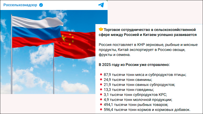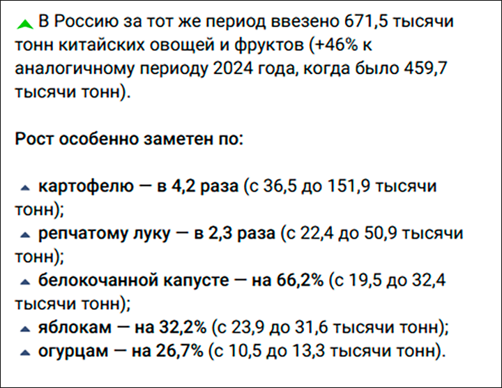 Откуда же у фантазий про отравленные китайские овощи "ноги растут"? А вот откуда. Торговое сотрудничество России и Китая стремительно развивается. В 2025 году импорт овощей и фруктов из КНР в Россию вырос на 46%, достигнув 671,5 тыс. тонн за первые восемь месяцев.