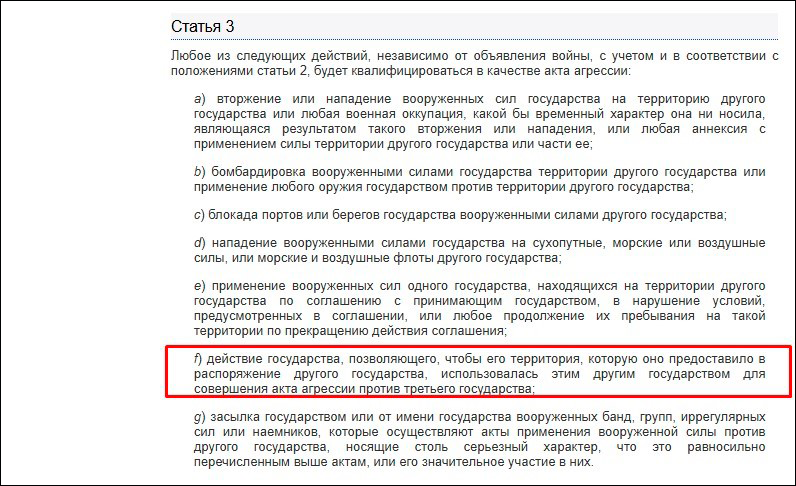 Действие государства, позволяющего, чтобы его территория, которую оно предоставило в распоряжение другого государства, использовалась этим другим государством для совершения акта агрессии против третьего государства.