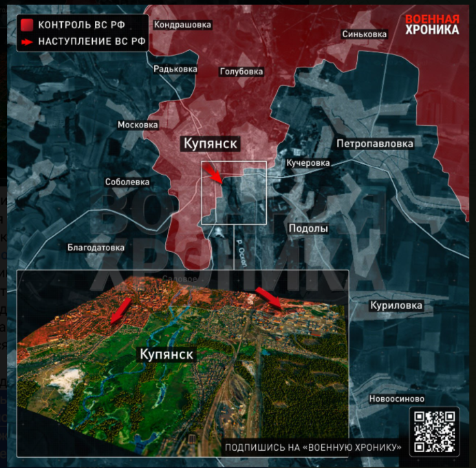 Министерство обороны РФ заявляет о взятии восточной части города. Значит, 116-я ОМБр, 112-я бригада ТрО и 30-я ОМБр либо нейтрализованы, либо отступили на юг. Ситуация для ВСУ осложняется тем, что дроноводы и артиллерия РФ систематически уничтожают переправы, по которым украинцы пытаются выйти с левого берега Оскола,