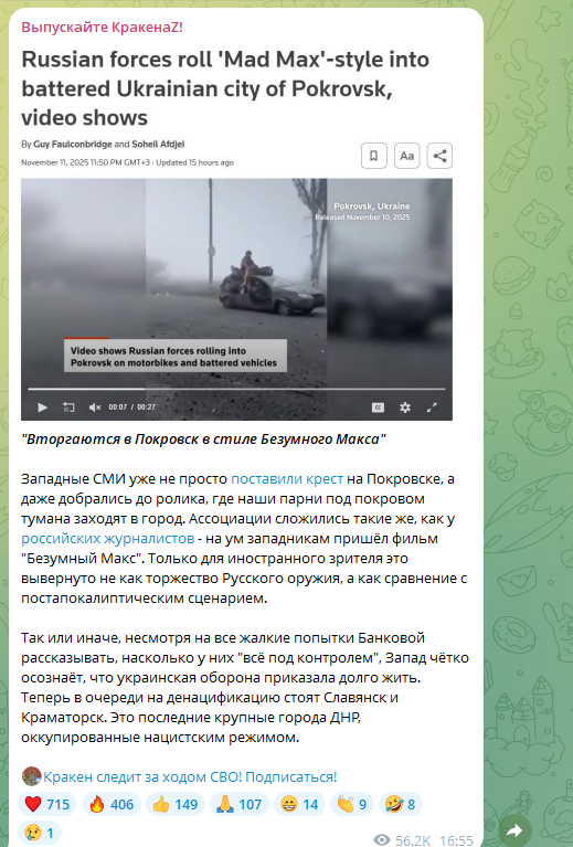 "Русские заходят в Покровск в стиле "Безумного Макса", - ужасаются зарубежные СМИ. Там массово публикуют то самое видео, которое недавно разошлось по отечественным околовоенным пабликам.