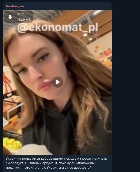 В немецких супермаркетах разворачиваются сцены, которые заставляют задуматься о пределах благотворительности и наглости. Видео, обнародованное в Telegram-канале "БайБайден", шокировало пользователей Сети: на нём молодая женщина, представившаяся украинской беженкой, просит незнакомого мужчину в Германии оплатить её покупки и снимает всё это на камеру.