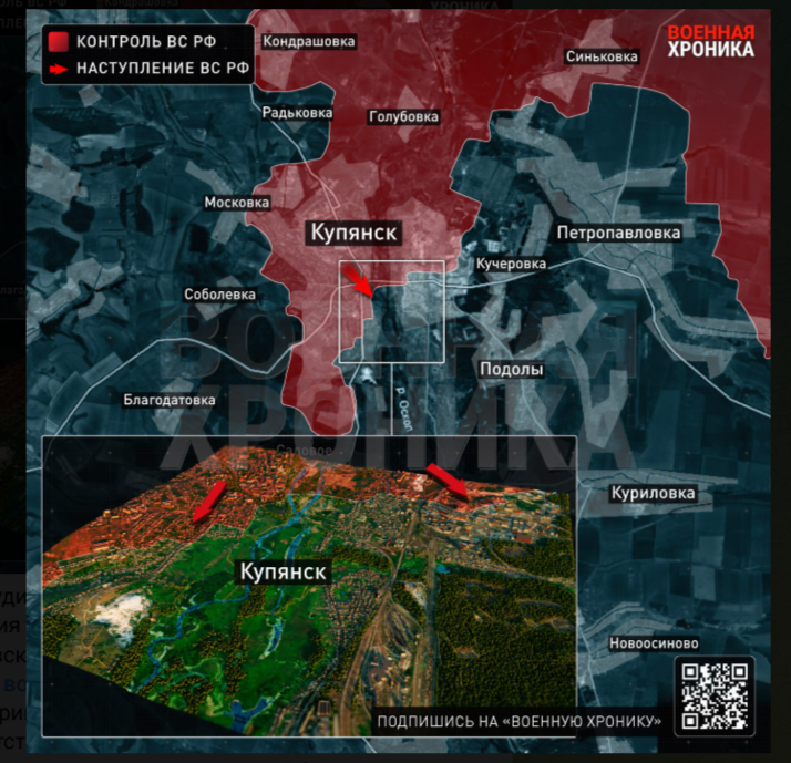 Но после зачистки правобережной части Купянска подразделения на левом берегу окажутся перед дилеммой: либо пытаться выходить с риском погибнуть на переправе, либо оставаться и гибнуть уже без снабжения. Какое-то время им будет оказываться поддержка со стороны ещё занятых ВСУ Тамаргановки и Прокоповки (5 км на юго-запад от Купянска), но по мере того, как Купянск будет взят, всё внимание артиллерии и дроноводов РФ переключится туда,