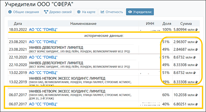 В апреле 2022-го компания сменила название с ООО "Уанвеб" на ООО "Сфера"//Скриншот страницы сайта list-org.com