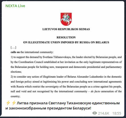 Литва пошла против России и Китая. Telegram-канал NEXTA Live опубликовал скриншот документа на английском языке. В нём говорится, что Литва признаёт экс-кандидата на пост главы государства, члена оппозиции Светлану Тихановскую законным президентом Белоруссии.