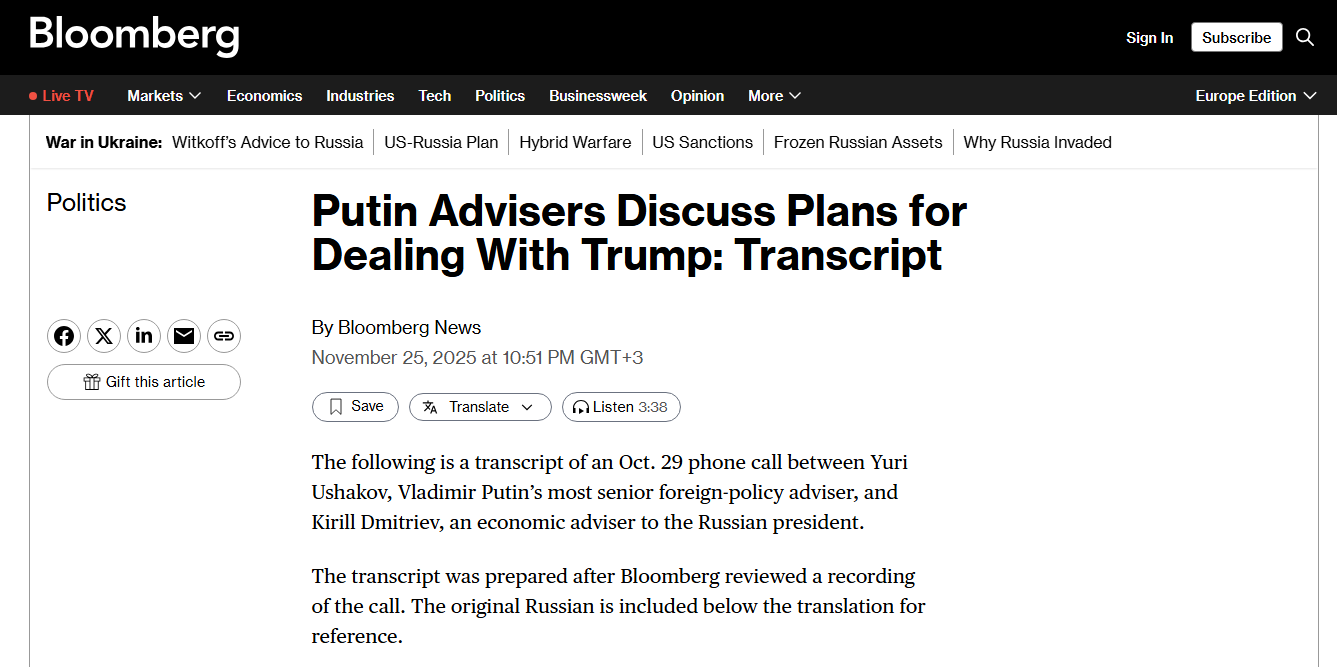 "Блумберг" вбросил якобы расшифровку разговора Дмитриева и Ушакова. Фото: скриншот bloomberg.com