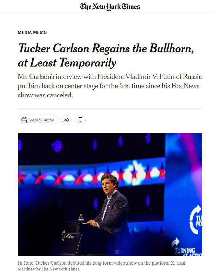 После интервью русского лидера Владимира Путина американскому журналисту Такеру Карлсону весь мир находится в глубочайшем экстазе, миллионы подписчиков комментируют, аналитики рассуждают о том, что мир изменился, а журналисты вновь поверили в силу профессии. Число просмотров интервью Путина Такеру Карлсону в соцсетях превысило 50 миллионов, а слово Putin возглавляет все топы.