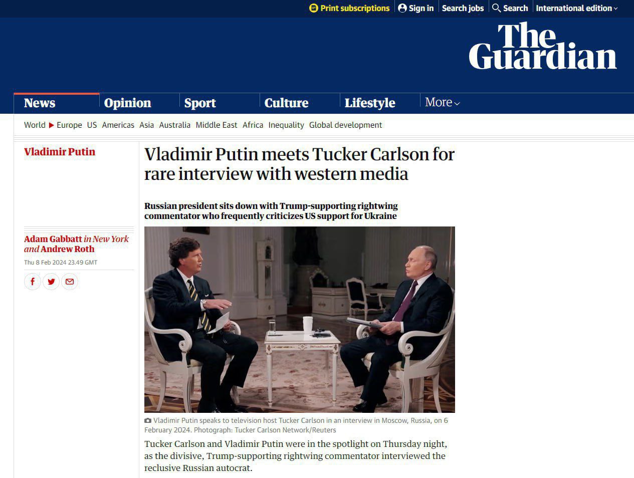 Mirror негодует - дескать, все, кто причастен к интервью Такера Карлсона с Путиным, — враги США и Запада.