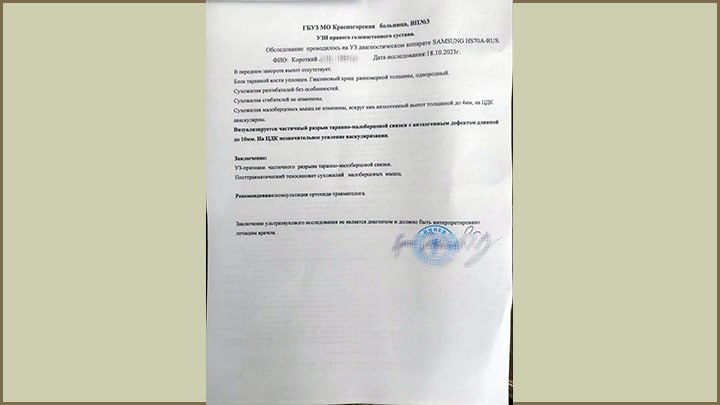 РЕЗУЛЬТАТЫ УЗИ ПРАВОГО ГОЛЕНОСТОПНОГО СУСТАВА АЛЕКСАНДРА КОРОТКОГО И ДИАГНОЗ: ЧАСТИЧНЫЙ РАЗРЫВ ТАРАННО-МАЛОБЕРЦОВОЙ СВЯЗКИ. СКРИНШОТ ДОКУМЕНТА, ПРЕДОСТАВЛЕННОГО ЦАРЬГРАДУ АДВОКАТОМ СЕРГЕЕМ ВАСИЛЬЕВЫМ