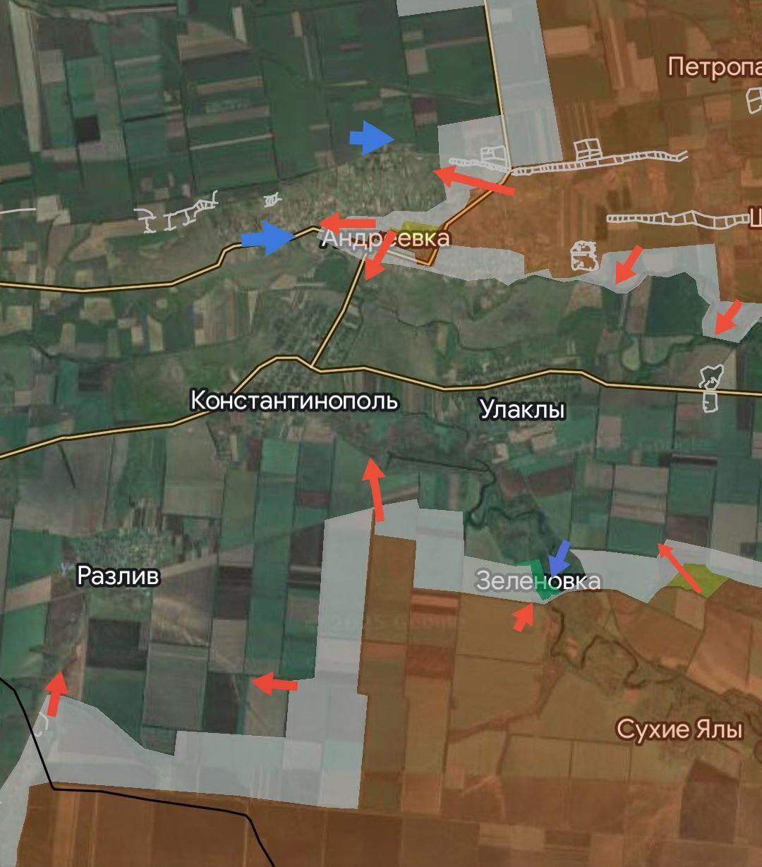 В полях южнее Разлива наблюдается рост активности русских штурмовиков. Украинские формирования пытаются поразить позиции ВС России в балке Капитан — вдоль нее, скорее всего, и будут атаковать русские штурмовые группы.