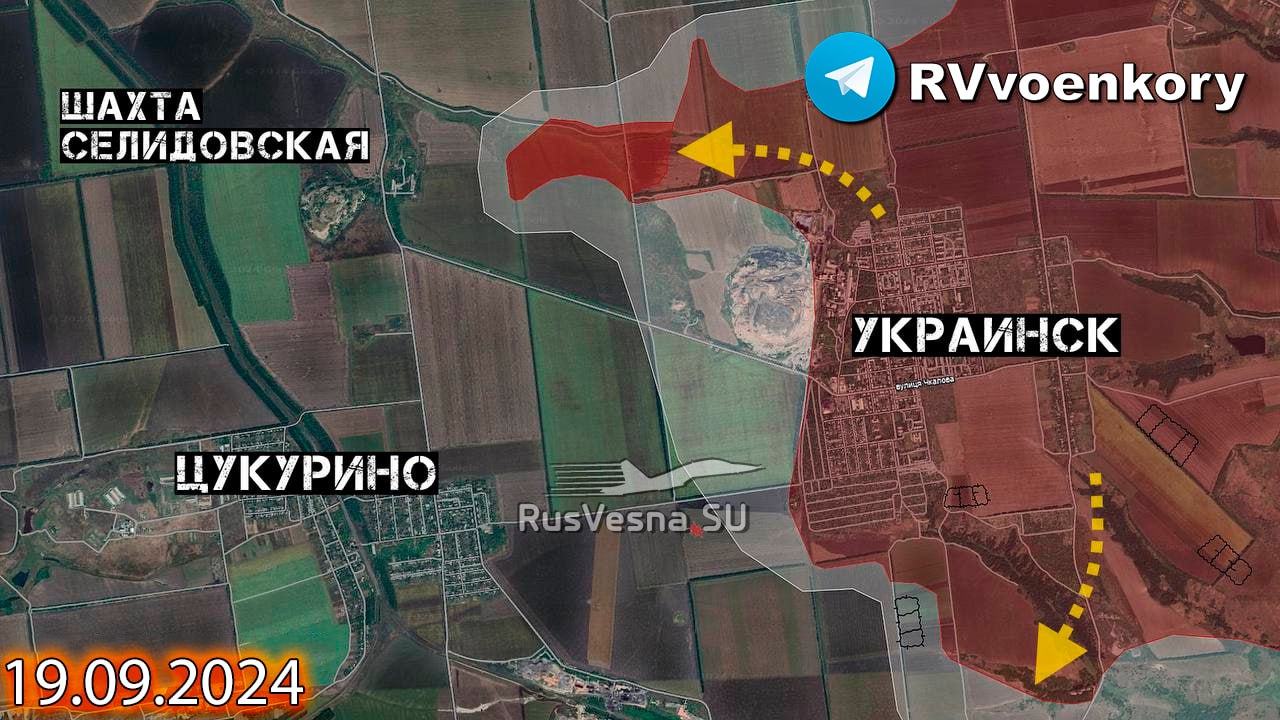 Военкоры отмечают, что украинские военные аналитики днем ранее наконец-то признали, что Украинск освобожден подразделениями группировки войск "Центр" и в новой сводке сообщают о продолжающемся продвижение русских войск к Селидово на стыке Покровского и Кураховского направлений.