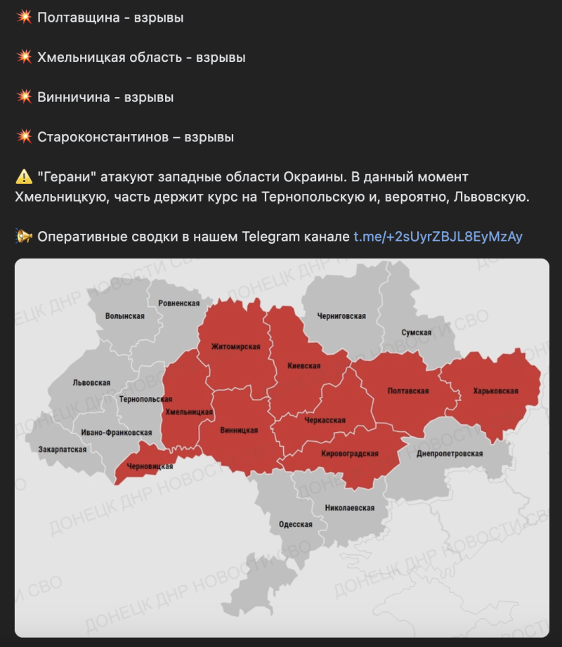 По информации телеграм-канала "ПолитНавигатор", в атаке помимо тяжёлого вооружения участвовало как минимум 32 беспилотника. По информации инсайдеров, главной целью стал город Староконстантинов в Хмельницкой области, где и находится злосчастный военный аэродром, по которому неоднократно ранее наносились удары.